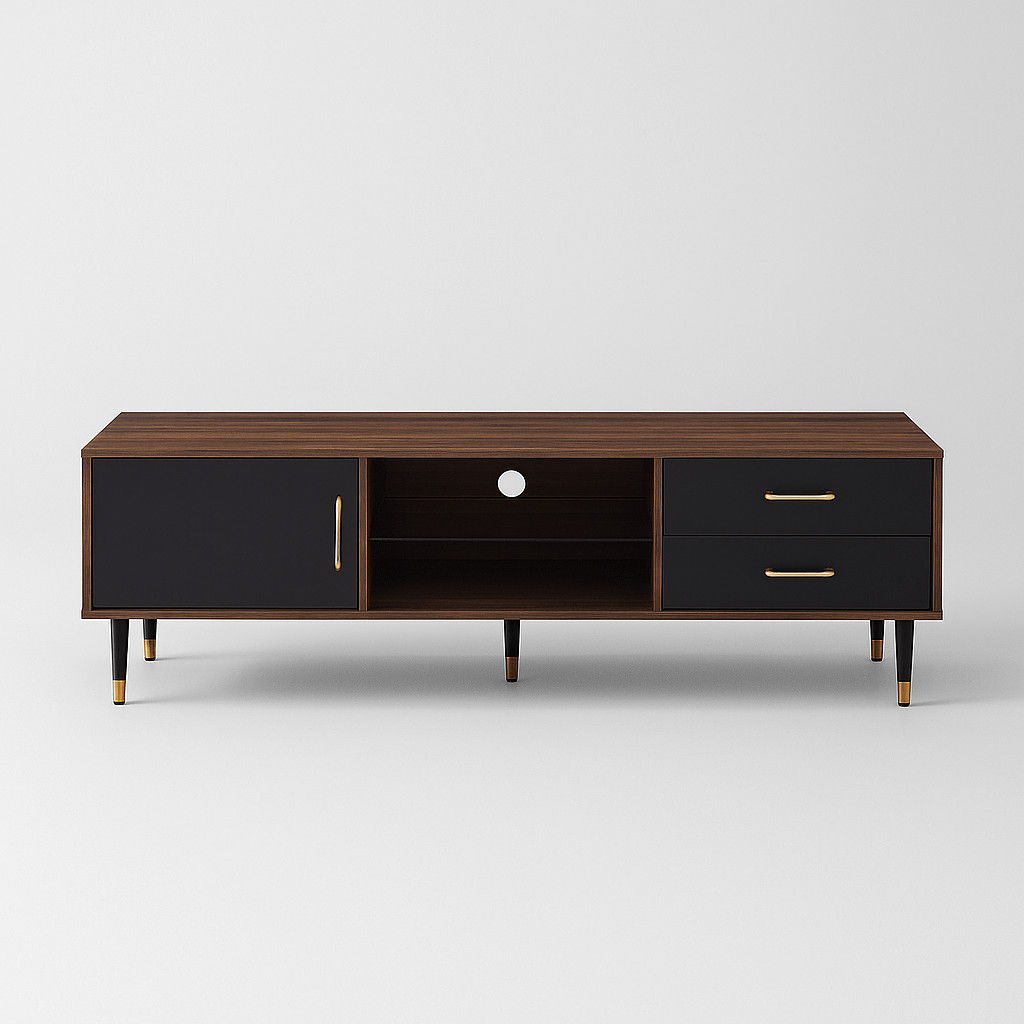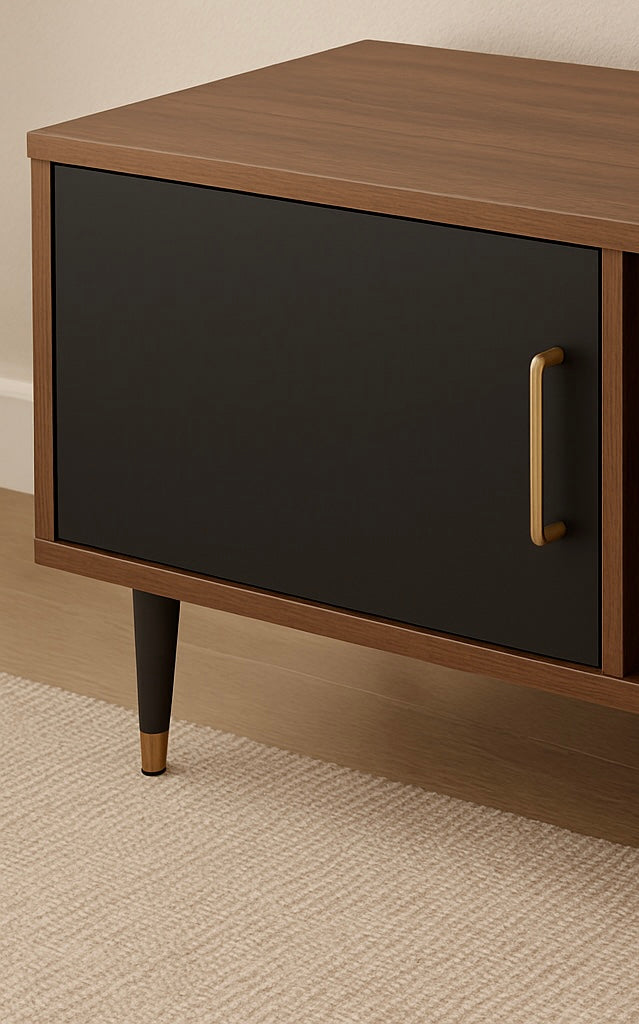 Dale un toque moderno y sofisticado a tu sala de estar con el Rack de TV Oslo. Su diseño contemporáneo combina la calidez de la madera en tono café con el contraste elegante de las cajoneras negras y detalles dorados en las manillas. Fabricado en resistente MDF, este mueble no solo destaca por su estilo, sino también por su funcionalidad.